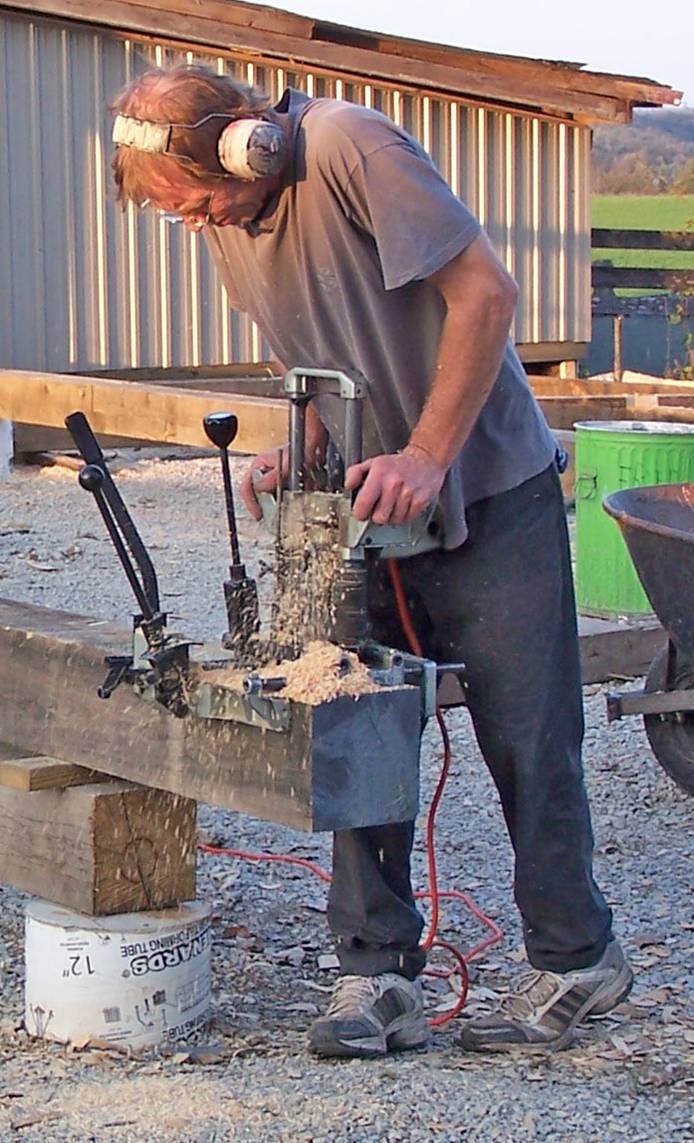 About 70% of the timber joints, mortise & tenon, were cut by hand, the way they would have been done over 100 years ago. As it got closer to raising day, we enlisted the help of another local Timber Framer, Phil Holtegaard, from Lanesboro, MN to help cut mortises with his chain mortiser. This is the “modern” version of the hand cranked boring machine & chisel. Thanks Phil!
